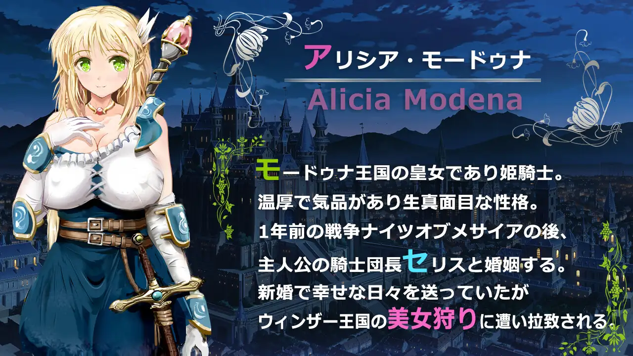 距离先前的战争、奈瑟堡之战一年后的世界。 塞里斯和艾丽西娅要结婚了。但是主人公塞里斯的妻子公主骑士艾丽西娅和他的妹妹格斗家玛雅被温莎王国的里兹王子绑架。 等待艾丽西娅和玛雅的是里兹的肉便器收藏. 在敌人大将的肉便器室,皇女艾丽西娅和玛雅成为了收藏的肉便器之一.