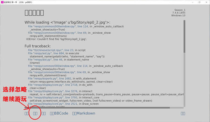 游戏现在会有报错,可以直接选择忽略,这样可以继续游玩,介意的等待以后修复,不介意的小伙伴可以先行选择游玩