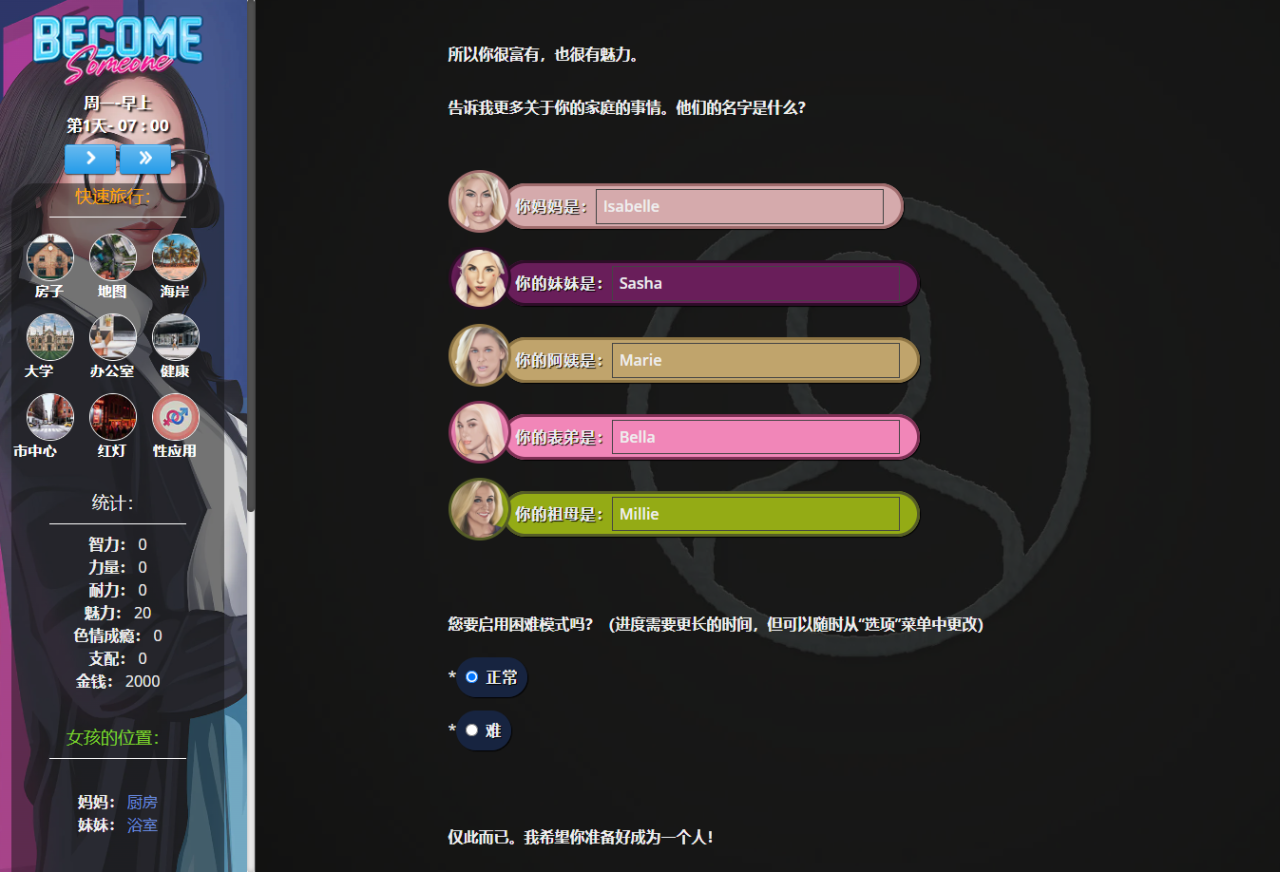 成为某人是一个成人生活模拟器游戏(HTML – 基于文本),让您能够选择一条人生道路,让您结识会根据您的统计数据以不同方式对您做出反应的女孩。我并没有让它变得很难玩,至少目前是这样,你应该毫不费力地访问色情内容(而且有很多)。你有完全的自由,所以你可以决定你想用你的生活做什么!