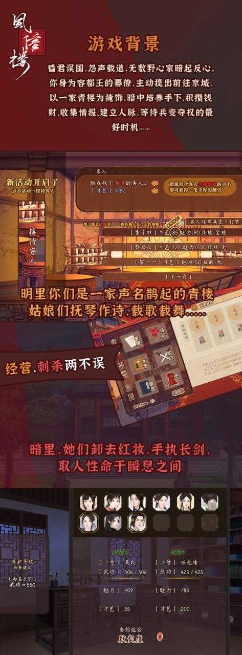 昏君误国,怨声载道,无数野心家暗起反心。在京城一家青楼的掩饰下,你培养手下、积攒钱财、收集情报、建立人脉,等待兵变夺权的最好时机……《风信楼》是一部拥有海量选项和丰富剧情的高自由度养成游戏——百种不同结局,尽在你的选择之中。