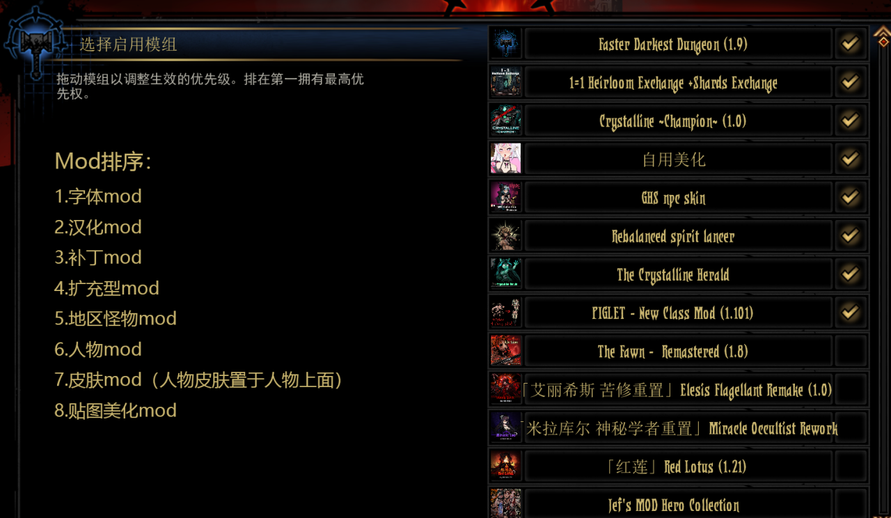 最近想玩暗黑地牢,但是发现站里最早都是20年的版本了。所以这里把我自己搜寻,加上晚了一段时间,整合了部分mod的一个版本放上来,里面包含lustiest lair和它配套的附件模组(这个模组是会全面的修改游戏内文本,汁液四溅的那种,如果是第一次体验这个游戏,建议和猩红庭院模组一样关闭,等通关一次之后再打上)除此之外,这里还整合了b站大佬名西酱的一个mod包,已经放在了根目录,请各位根据需要自取
