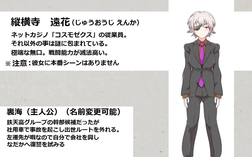 在思考途中,主角遇到了网络赌场「コスモゼクス」,了解到在那里甚至可以押注「行动自由」。