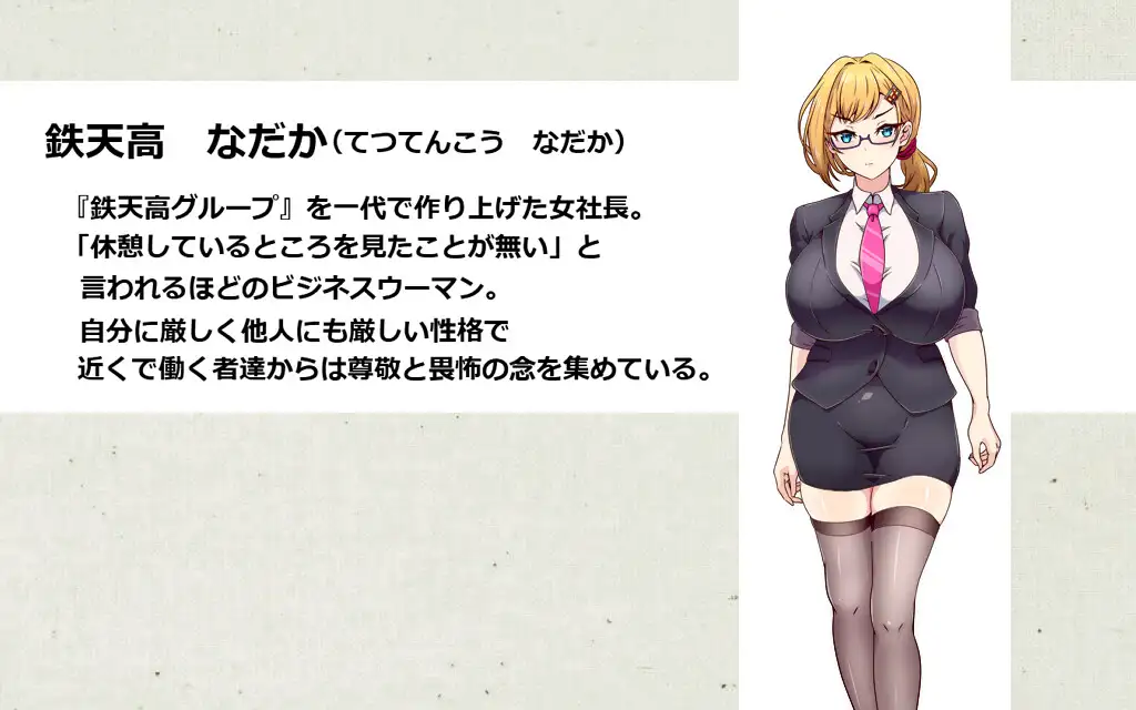 由于被流放到公司内闲置岗位,主角对引发这一事端的女社长「鉄天高 なだか」产生了报复之心。