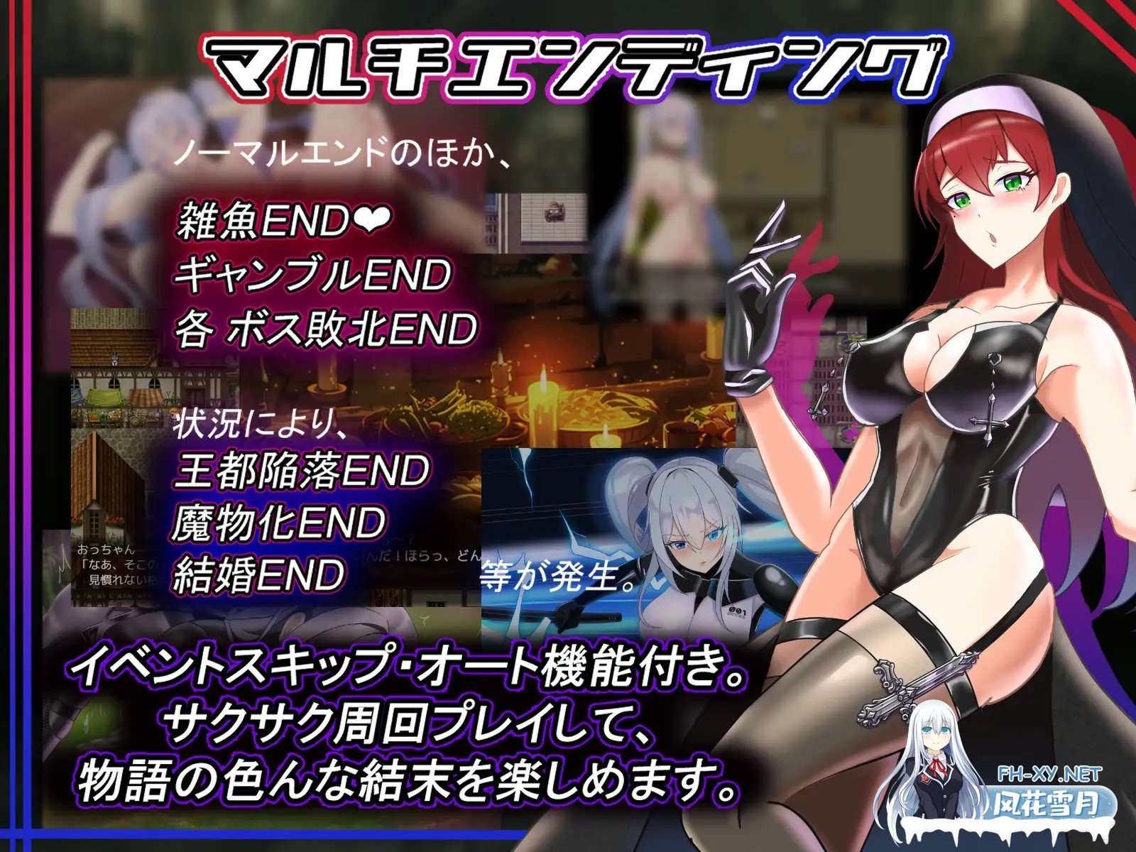 『游戏概述』 人间界与魔界。 两个世界相连,数百年来一直进行着激烈的争斗。人类最强的战士艾莉丝, 根据军方的指令,时光倒流到了200年前, 前往讨伐被认为是众恶之源的魔王…。游戏概要 带有战斗的传统RPG。◆H场景 × 68场 ◆基本HCG × 46 ◆总CG张数 × 900张以上 ◆ED数 × 7种 (其中6种有发情状态分歧) +杂鱼END 8种 (对低级魔物等发情度达到60以上失败)●H场景喘息声音 ●场景・CG回忆功能 可立即全部解放 ●可清除处女状态 ●带有跳过和自动功能 ●排除等级提升、解谜等元素◆实现性爱状态![发情状态] 包括达到顶点次数,经验人数,接受数等的计数…[第一次伴侣]等等也有记录!由于发情度的不同,事件和故事有所变化,敬请留意!!◆专注点!(1) 适合只想简单享受事件和CG的玩家的即时全开放和回忆系统。(2) 浓厚的色情和沉浸感 追求浓郁的H事件的实用性。 此外,部分音频和SE采用了双耳式设计。※关于全部解放 关于即时解放功能 想要快速观看H场景的人, 或者想要立刻拿来做料理的人, 我们也提供了即时解放功能!!① 旧发电所的闪闪发光之处 ② 城堡的私人房间书架