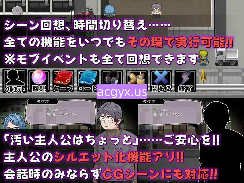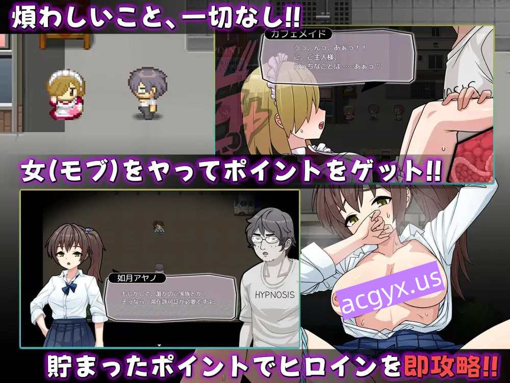 切换昼夜探索街道,看到女性(路人)就侵犯她们来获取点数。